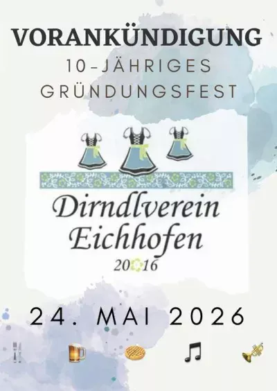 🎉 Vorankündigung zum 10-jährigen Gründungsfest des Dirndlverein Eichhofen! Am 24. Mai 2026 wird in Obereichhofen im Zenzn Stadl gemeinsam gefeiert – ein besonderer Tag für alle Mitglieder, Freunde, Unterstützer und Fans des Vereins. 💙 Der Flyer kündigt das 10-jährige Gründungsfest des Dirndlverein Eichhofen 2016 an und macht jetzt schon Lust auf einen stimmungsvollen Festtag mit geselligem Beisammensein, guter Musik und echter Feierlaune. 🍻🎶🥨 Als Veranstaltungsort ist Obereichhofen (Zenzn Stadl) hinterlegt. Wer also traditionelle Stimmung, ein schönes Vereinsfest und ein herzliches Miteinander schätzt, sollte sich diesen Termin unbedingt vormerken. 🕺💃 Jetzt schon den 24.05.2026 im Kalender markieren und beim Jubiläumsfest des DVE dabei sein! 🔥