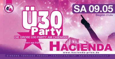 🎉 Ü30 PARTY CHIEMSEE in der Hacienda – Hacienda goes Ü30! Unter dem Motto „Feiern wie früher“ steigt am Samstag, 09.05.2026 die große Ü30 Party am Chiemsee. Gefeiert wird im Eventbereich der Hacienda in Prien, früher bekannt als Tanzcafé Reiter. 🕺💃 Freu dich auf DJ C-MON aus dem Umfeld von Ü30 Munich/Rosenheim und einen bunten Musikmix aus 90s Dance, Charts, House, Rock, Classics und HipHop 🎶🔥 Genau der richtige Soundtrack für alle, die ausgelassen feiern und tanzen wollen. Los geht’s um 21:00 Uhr – mit Welcome Drink zur Begrüßung 🍹 Einlass ist ab 28+ Jahren. Der Eingang erfolgt über die Terrasse, wie auf dem Flyer angegeben. Karten sind im Vorverkauf erhältlich. Also: Save the Date und sichere dir deinen Abend voller Nostalgie, Partyfeeling und guter Musik direkt am Chiemsee! 🎧✨ Reservierungen und Tickets unter www.hacienda-prien.de