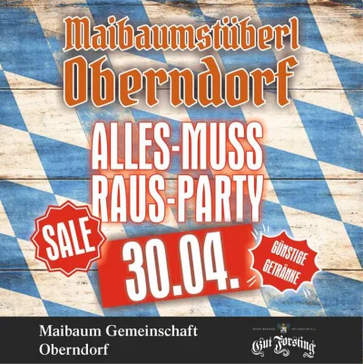 🎉 „Alles muss raus“ in Oberndorf geht am 30.04.2026 an den Start – und der Name ist Programm! Beim Maibaumstüberl Oberndorf lädt die Maibaum Gemeinschaft Oberndorf zur stimmungsvollen Alles-muss-raus-Party ein. 🍻 Der Flyer verspricht nicht nur echtes Partyfeeling, sondern auch günstige Getränke und eine zünftige Atmosphäre im Stil des Gut Forsting. Perfekt also, um mit Freunden in den Mai hinein zu feiern und einen geselligen Abend in Oberndorf bei Ebersberg zu verbringen. 🕺💃 Wenn du Lust auf eine unkomplizierte Partynacht mit Sale-Charakter, guter Stimmung und lockerer Feierlaune hast, solltest du dir diesen Termin sichern: 30.04.2026 in Oberndorf. 🔥🎶 Also raus aus dem Alltag und rein ins Maibaumstüberl – hier heißt es feiern, anstoßen und den Abend genießen!