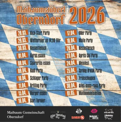Hier wartet ein Highlight der Festreihe auf euch. 🔥 Das angegebene Bergfest findet am 29.04.2026 in Oberndorf bei Ebersberg statt und ist eingebettet in das große Programm des Maibaumstüberls Oberndorf 2026. Der Flyer zeigt rund um diese Zeit echte Partystimmung mit Formaten wie 90er Party, Malle Party, Après-Ski Party, Weinfest, Spring Break Party und der Alles-muss-raus Party. 💃🕺 Freut euch auf beste Bergfest-Stimmung im Rahmen der Maibaum-Saison in Oberndorf – perfekt zum Zusammenkommen, Anstoßen und Feiern mit Freunden! 🎧
