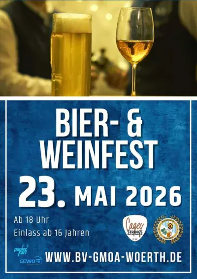 🍺🍷 Bier- & Weinfest – der perfekte Treffpunkt für alle, die gute Stimmung, kühle Drinks und einen geselligen Abend lieben! Los geht’s am 23.05.2026 ab 18:00 Uhr. Das Bier- & Weinfest startet offiziell um 18:00 Uhr und ist für alle ab 16 Jahren zugänglich – genau die ideale Gelegenheit, mit Freunden entspannt zu feiern und gemeinsam den Abend zu genießen. 🎉 Freu dich auf eine stimmungsvolle Mischung aus Biergenuss und Weinlaune in Wörth/Gmoa-Wörth. Ob frisch gezapftes Bier oder ein gutes Glas Wein – hier kommen Genießer voll auf ihre Kosten. 🍻🥂 Der Flyer macht klar: Dieses Fest steht ganz im Zeichen eines lockeren, geselligen Ambientes mit bester Feierlaune. Also Termin vormerken, Leute zusammentrommeln und am 23. Mai 2026 vorbeischauen! 🔥