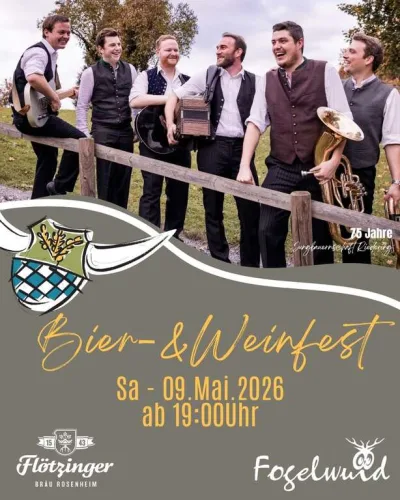🍻🍷 Bier & Weinfest in Fögelwuid! Am Samstag, den 09. Mai 2026, wird in Fögelwuid gefeiert: Das Bier & Weinfest startet ab 19:00 Uhr und verspricht einen geselligen Abend voller guter Stimmung, kühler Getränke und bester Unterhaltung. 🎶 Schon der Flyer macht Lust auf ein echtes Fest mit uriger Atmosphäre – passend begleitet von der Jubiläumsstimmung rund um „75 Jahre Superboarisch Miteinand“. Mit dabei ist Flötzinger Bräu Rosenheim, was das Event für Bierliebhaber zusätzlich besonders macht. 🍺 Ob mit Freunden, Vereinskollegen oder der ganzen Feiertruppe: Hier treffen Biergenuss, Weinfest-Flair und gemütliches Beisammensein aufeinander. Also Termin vormerken und vorbeikommen, wenn Fögelwuid zum Bier & Weinfest lädt! 🕺💃🔥