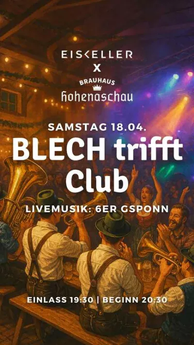 🎉 BLECH trifft CLUB am 18.04.2026 im Eiskeller Aschau 🎶 Erlebt ein einzigartiges Kunstprojekt mit Livemusik von 6er Gsponn ab 20:30 Uhr und einem unserer Resident DJs ab 00:30 Uhr! 🍻 Genießt frisch gezapftes Weißbier und eine unvergessliche Nacht in Tracht! 💃🕺 Sichert euch schnell eure Tickets, der Großteil ist schon vergriffen! Einlass ab 19:30 Uhr, ab 18 Jahren. 🎟️ Tickets gibt es hier: https://www.eventim-light.com/de/a/67fd4b922c069151b9bc1ca2/e/697a0bfe862f444ec6be4c79?lang=de