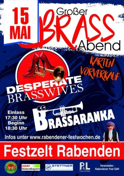 🎺 Brass Abend Rabenden – ein Abend voller Blasmusik-Power im Festzelt Rabenden! Am 15. Mai heißt es Bühne frei für Brassaranka und die Desperate Brasswives – genau das Richtige für alle, die energiegeladene Brass-Sounds und beste Festzeltstimmung lieben. 🔥🎶 Die vorhandene Ankündigung macht es schon klar: Brass Abend mit Brassaranka und den Desperate Brasswives – und genau das verspricht ein mitreißendes Live-Erlebnis mit sattem Sound, Partylaune und musikalischer Stimmung bis in den Abend. 💃🕺 Los geht’s mit Einlass ab 17:30 Uhr, Beginn ist um 18:30 Uhr im Festzelt Rabenden in 83352 Altenmarkt / Rabenden. Karten sind im Vorverkauf erhältlich. Mehr Infos findest du unter www.rabendener-festwochen.de. Also schnell Tickets sichern und dabei sein, wenn Rabenden zum Treffpunkt für Brass-Fans wird! 🎉🍻