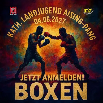 🥊 Burschen Boxen in Aising-Pang! Am 04.06.2027 heißt es: Jetzt anmelden und ab in den Ring! Der Flyer bewirbt das Boxen der kath. Landjugend Aising-Pang und richtet sich an alle, die Lust auf sportliche Action, Kampfgeist und ein starkes Event mit echter Wettkampf-Atmosphäre haben. 🔥 Unter dem Motto „Jetzt anmelden! Boxen“ steht ein energiegeladener Tag bevor, bei dem Fairness, Ausdauer und Adrenalin im Mittelpunkt stehen. Wer sich der Herausforderung stellen möchte, sollte sich den Termin vormerken und die Anmeldung nicht verpassen. 💪 Veranstalter laut Flyer ist die Kath. Landjugend Aising-Pang. Perfekt für alle, die Boxsport spannend finden und Teil eines besonderen lokalen Sportevents werden wollen. 🎉