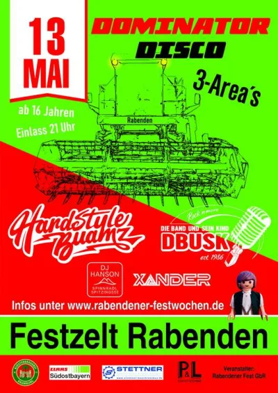 🔥 Dominator Disco im Bierzelt – 3 Areas! In Rabenden wird am 13. Mai das Festzelt zur Partylocation für alle Feierfreudigen ab 16 Jahren. Einlass ist ab 21 Uhr – beste Voraussetzungen für eine lange Nacht voller Beats, Stimmung und Festival-Feeling. 🎉🎧 Mit dabei: Hardstyle Buamz, Xander, DBUSK und DJ Hanson vom Spinnradl / Spitzingsee. Freu dich auf einen energiegeladenen Mix aus harten Sounds, Partyhits und besten Club-Vibes – verteilt auf gleich 3 Areas. 💃🕺🔥 Die Dominator Disco Rabenden verspricht eine legendäre Zeltparty mit großem Line-up und ordentlich Eskalationspotenzial. Weitere Infos findest du unter www.rabendener-festwochen.de. Also Freunde schnappen und ab ins Festzelt Rabenden! 🍻🎶