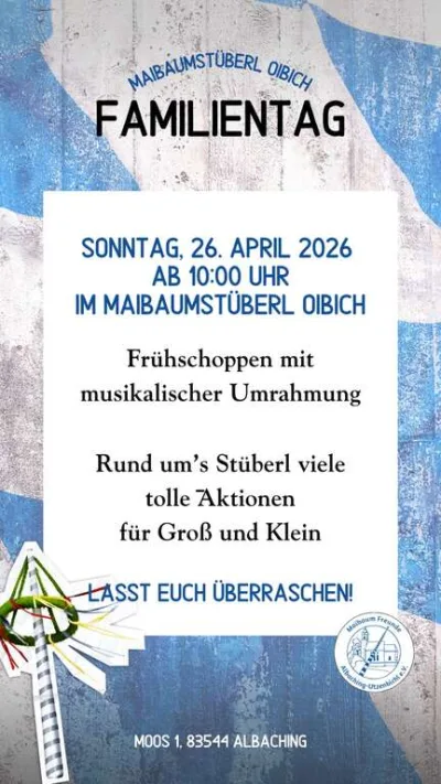 🎉 Familientag im Maibaumstüberl Oibich: Am Sonntag, 26. April 2026, seid ihr ab 10:00 Uhr in Moos 1, 83544 Albaching herzlich willkommen! Im Maibaumstüberl Oibich erwartet euch ein geselliger Frühschoppen mit musikalischer Umrahmung – perfekt für einen entspannten Tag mit Familie und Freunden. 🎶🍻 Rund um’s Stüberl gibt es viele tolle Aktionen für Groß und Klein, sodass garantiert keine Langeweile aufkommt. Ob gemütliches Beisammensein, Musik oder Überraschungen für die ganze Familie – hier ist für jede Generation etwas dabei. 👨👩👧👦✨ Lasst euch überraschen und verbringt einen stimmungsvollen Sonntag beim Familientag in Albaching. Ein schönes Ausflugsziel für alle, die Gemeinschaft, Musik und besondere Momente in familiärer Atmosphäre lieben! 💙