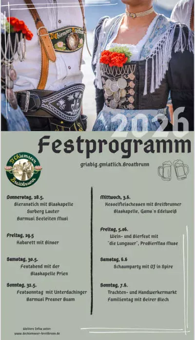🎉 Festsonntag Trachtenverein in Breitbrunn a. Chiemsee! Auch wenn die vorhandene Beschreibung kaum Infos zum Ablauf enthält, steht der Ort klar fest: Breitbrunn a. Chiemsee freut sich auf einen stimmungsvollen Festtag im Rahmen des Festprogramms 2026. 🥨🎶 Laut Flyer findet am Sonntag, 31.05.2026, der Festsonntag mit den Unterdachinger Baramusi Preaner Buam statt – also beste Aussichten auf echte Blasmusik, Tradition und gesellige Festzeltstimmung. 💃🕺🍻 Der Titel „Festsonntag Trachtenverein“ verspricht einen Tag ganz im Zeichen von Brauchtum, Musik und Gemeinschaft. Perfekt für alle, die bayerische Atmosphäre lieben und einen besonderen Sonntag am Chiemsee erleben möchten. 🔥 Weitere Programmpunkte des Festprogramms reichen von Bieranstich über Kabarett bis Schaumparty – der Festsonntag ist damit Teil eines vielseitigen Veranstaltungsrahmens in Breitbrunn. Früh kommen lohnt sich, um das Flair vor Ort voll auszukosten! 🎺🍺