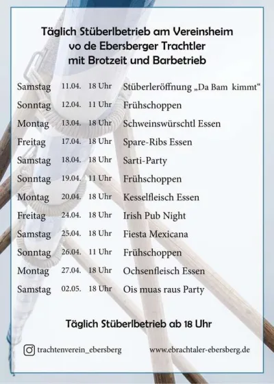 🍀 Irish Pub Night im Maibaumstüberl vom Trachtenverein G.T.E.V. Ebrachtaler Ebersberg – ein geselliger Abend für alle Fans von gemütlicher Wirtshausstimmung und echter Stüberl-Atmosphäre! 🎶🍻 Wie in der vorhandenen Ankündigung beschrieben, ist die Irish Pub Night Teil des täglichen Stüberlbetriebs vom 11.04. bis 02.05.2026 beim Vereinsheim der Ebersberger Trachtler mit Brotzeit und Barbetrieb. Laut Flyer startet die Irish Pub Night am Freitag, 24.04., um 18:00 Uhr. Freut euch auf einen stimmungsvollen Abend im Maibaumstüberl in Ebersberg – ideal zum Zusammensitzen, Ratschen und Genießen in uriger Umgebung. 🍺✨ Ob mit Freunden, Vereinskollegen oder Familie: Hier trifft lockere Pub-Stimmung auf bayerische Gastlichkeit. Der Flyer kündigt außerdem täglich Stüberlbetrieb am Vereinsheim der Ebersberger Trachtler an – mit weiteren Highlights wie Frühschoppen, Sarti-Party, Fiesta Mexicana und verschiedenen Essensabenden. Für die Irish Pub Night heißt es also: vorbeikommen, anstoßen und einen besonderen Abend erleben! 🥨🎉