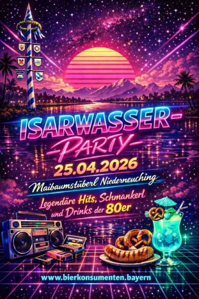🎉 Im Rahmen des Maibaumstüberls in Niederneuching veranstaltet der Neichinger Bierkonsumentenverein e.V. die Isarwasser-Party – und die hat echtes Kultpotenzial! Am 25.04.2026 erwartet euch im Maibaumstüberl Niederneuching eine stimmungsvolle Partynacht mit legendären Hits, Schmankerl und Drinks der 80er. 🕺🎶 Freut euch auf nostalgisches Retro-Feeling, gute Laune und eine Feier, bei der Mitsingen, Tanzen und ausgelassenes Zusammensein garantiert sind. Ob mit Freunden, Vereinskollegen oder der ganzen Party-Crew – hier trifft zünftige Atmosphäre auf 80er-Vibes und besondere Isarwasser-Stimmung. 🍻🔥 Also Termin merken und vorbeikommen, wenn Niederneuching feiert: Die Isarwasser-Party verspricht eine legendäre Nacht voller Musik, Genuss und bester Feierlaune! 🎧💃