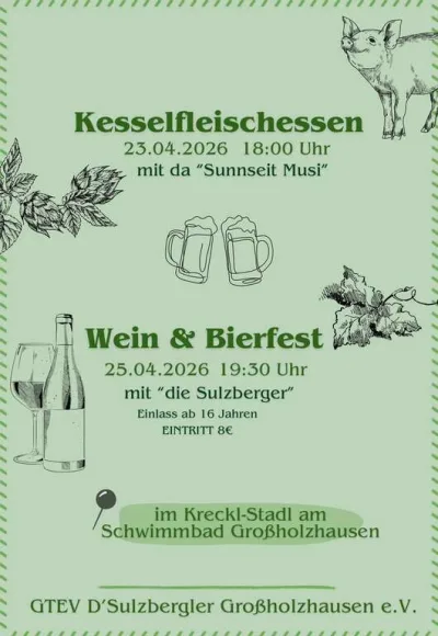 Kesselfleischessen in Großholzhausen – ein gemütlicher Abend für alle, die gute Stimmung, deftige Schmankerl und zünftige Musik lieben! 🎉🍻 Am 23.04.2026 geht’s ab 18:00 Uhr im Kreckl-Stadl am Schwimmbad Großholzhausen los. Für die passende musikalische Begleitung sorgt die „Sunnseit Musi“ und macht den Abend besonders urig und stimmungsvoll 🎶 Freu dich auf gesellige Stunden in traditioneller Atmosphäre, gutes Essen und beste Unterhaltung mit Freunden, Familie und Bekannten. Wer bayerische Gemütlichkeit schätzt, ist hier genau richtig 🕺💃 Veranstaltungsort ist der Kreckl-Stadl am Schwimmbad Großholzhausen. Ausrichter ist der GTEV D’Sulzbergler Großholzhausen e. V. Jetzt Termin vormerken und einen geselligen Abend beim Kesselfleischessen nicht verpassen! 🔥
