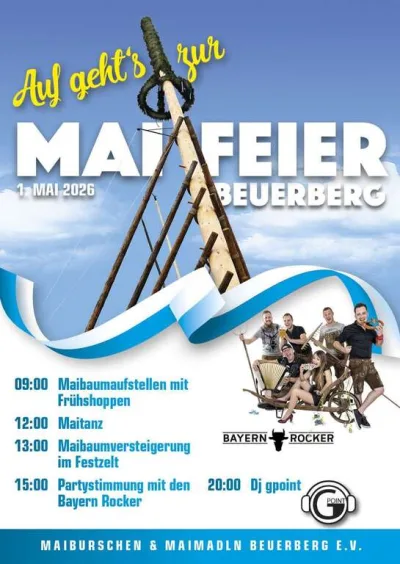 Auf geht’s zur Maifeier Beuerberg am 1. Mai 2026! 🎉🌸 In Beuerberg wartet ein traditioneller Feiertag voller Stimmung, Musik und bester Festzelt-Atmosphäre auf euch. Los geht’s bereits um 09:00 Uhr mit dem Maibaumaufstellen und Frühschoppen. Ab 12:00 Uhr folgt der Maitanz, bevor um 13:00 Uhr die Maibaumversteigerung im Festzelt startet. Ab 15:00 Uhr sorgen die Bayern Rocker für beste Partystimmung und am Abend übernimmt ab 20:00 Uhr DJ gpoint 🎶🔥 Die Maifeier Beuerberg verbindet Brauchtum, Frühschoppen, Tanz und Party an einem Tag – perfekt für alle, die den 1. Mai in geselliger Runde feiern wollen. Also raus nach Beuerberg, Freunde schnappen und einen ganzen Feiertag mit Musik, guter Laune und echter Maifest-Stimmung genießen! 🍻💃🕺