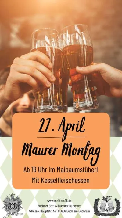 Maurer Montag im Maibaumstüberl in Buch am Buchrain – der perfekte Start in die Woche für alle, die es herzhaft und gemütlich mögen 🍻🎉 Am 27. April geht’s ab 19 Uhr los: Freu dich auf einen geselligen Abend mit Kesselfleischessen im Maibaumstüberl. Laut Flyer findet das Event bei Buchner Bixn & Buchner Buam Dirschen, Hauptstr. 44, 85656 Buch am Buchrain statt. Der vorhandene Hinweis auf den Standort in Buch am Buchrain bleibt klar: Hier trifft man sich in entspannter Atmosphäre, stößt gemeinsam an und genießt gutes Essen in bester Gesellschaft. Wer einen urigen Abend mit deftiger Küche und echter Wirtshausstimmung sucht, ist hier genau richtig 🕺🥘🍺 Also schnapp dir deine Freunde und sei dabei, wenn der Maurer Montag wieder zum Treffpunkt für Genießer und Feierfreudige wird! 🔥