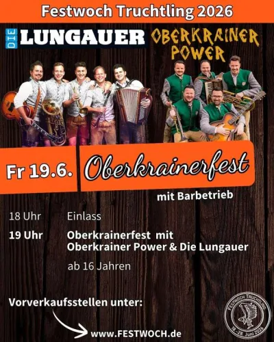 🎶 Oberkrainerfest in Truchtlaching! Im Rahmen der Festwoch Truchtling 2026 erwartet euch ein stimmungsvoller Abend mit Oberkrainer Power und Die Lungauer. Mit Barbetrieb. 🎉 Am Freitag, 19.06.2026, öffnet der Einlass ab 18:00 Uhr, los geht das Oberkrainerfest um 19:00 Uhr. Freut euch auf beste Oberkrainer-Musik, echte Festzeltstimmung und einen Abend voller Stimmung, Geselligkeit und musikalischer Highlights. 🍻🕺 Mit Die Lungauer und Oberkrainer Power stehen gleich zwei starke Acts auf der Bühne, die für beste Unterhaltung und ein unvergessliches Live-Erlebnis sorgen. Der Eintritt ist ab 16 Jahren möglich. Tickets und Vorverkaufsstellen findet ihr unter www.FESTWOCH.de. Jetzt Termin vormerken und mit Freunden in Truchtlaching gemeinsam feiern! 🔥
