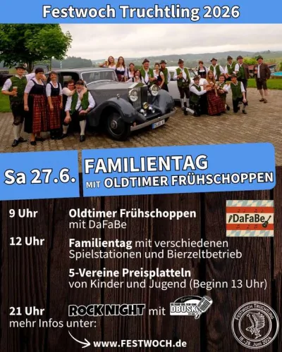🚗🎉 Oldtimertreffen Truchtlaching beim Familientag der Festwoch Truchtling 2026! Im Bierzelt in Truchtlaching erwartet euch ein abwechslungsreicher Tag für die ganze Familie. Los geht’s um 9 Uhr mit dem Oldtimer Frühschoppen mit „DaFaBe“ – perfekt für alle, die historische Fahrzeuge und gesellige Stimmung lieben. Ab 12 Uhr startet der Familientag mit verschiedenen Spielstationen und Bierzeltbetrieb, sodass Groß und Klein auf ihre Kosten kommen. 🥨🍻 Ein besonderes Highlight am Nachmittag: das 5-Vereine Preisplatteln der Kinder und Jugend, Beginn ist um 13 Uhr. Hier wird Brauchtum lebendig und echte Festzeltstimmung garantiert! 💃🕺 Ab 21 Uhr wird’s dann laut und rockig bei der Rock Night mit „DBUSK“! 🎸🔥 Kommt vorbei nach Truchtlaching und erlebt einen stimmungsvollen Festtag voller Oldtimer, Musik, Tradition und Unterhaltung für die ganze Familie.