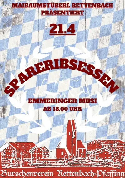 🥩🎶 Spareribsessen in Rettenbach/Pfaffing – ein gemütlicher Abend für alle, die deftiges Essen, Musik und bayerische Stimmung lieben! Am 21.04.2026 lädt das Maibaumstüberl Rettenbach zum Spareribsessen ein. Los geht’s ab 18:00 Uhr, begleitet von Emmeringer Musi – beste Unterhaltung und gesellige Atmosphäre inklusive. 🍻 Standort: Neuhäusl 1, 83539 Pfaffing. Ob mit Freunden, Familie oder dem Verein – hier erwartet euch ein uriger Abend mit leckerem Essen, traditionellem Flair und echter Dorfkultur. 🔥 Präsentiert vom Burschenverein Rettenbach-Pfaffing verspricht die Veranstaltung einen stimmungsvollen Treffpunkt für alle, die bayerische Geselligkeit schätzen. Also Termin vormerken und vorbeikommen! 🕺💃