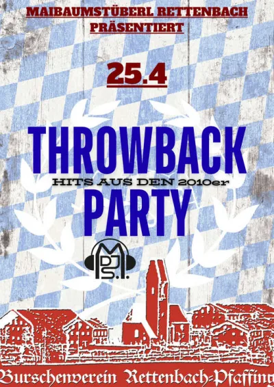 🎉 Throwback Party in Pfaffing! Standort: Neuhäusl 1, 83539 Pfaffing – hier steigt am 25.04.2026 eine Partynacht für alle, die die besten Hits aus den 2010er Jahren nochmal richtig feiern wollen. Das Maibaumstüberl Rettenbach präsentiert diese besondere Nacht gemeinsam mit dem Burschenverein Rettenbach-Pfaffing. 🔥 Unter dem Motto „Throwback Party – Hits aus den 2010er“ erwartet dich eine ausgelassene Feier mit den Sounds eines unvergesslichen Jahrzehnts. Für die passende Stimmung sorgt DJ M.S. und bringt die Dancefloor-Hits, Ohrwürmer und Party-Classics der 2010er auf die Anlage. 🎧🎶 Also schnapp dir deine Freunde und mach dich bereit auf eine Nacht voller Erinnerungen, guter Laune und bester Party-Vibes in Pfaffing! 💃🕺🍻